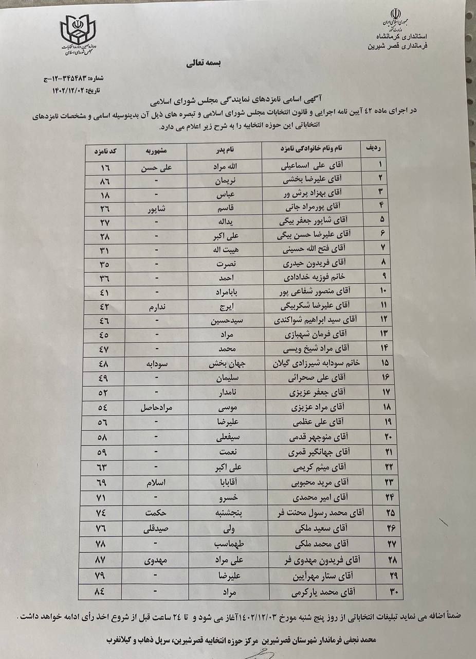 آگهی اسامی نامزدهای نمایندگی مجلس در حوزه انتخابیه قصرشیرین ،گیلانغرب وسرپل ذهاب