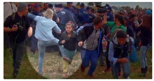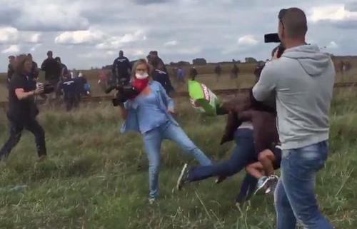 پناهنده سوری همراه با سایر پناهندگان در حالی که کودک خود را در آغوش گرفته بود، با سرعت می دوید اما خبرنگار مجارستانی به عمد او را لگد زد و باعث شد همراه با کودکش نقش بر زمین شود.