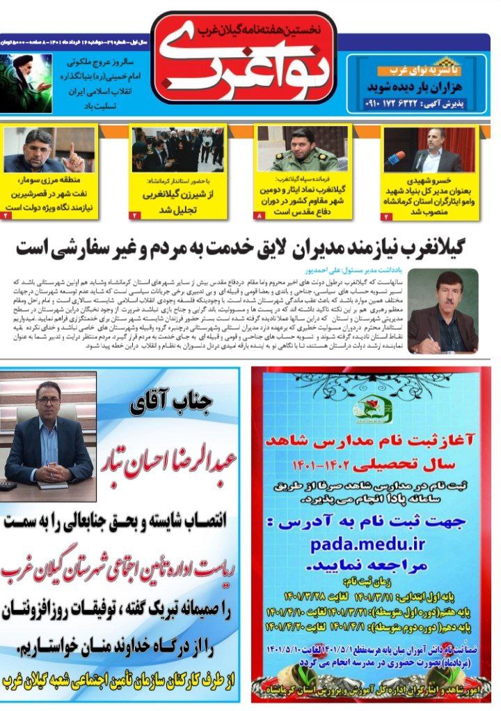 تازه ترین شماره هفته نامه “نوای غرب “منتشر شد