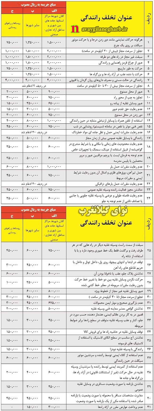 به گزارش نوای گیلانغرب جدول کامل نرخ جرایم تخلفات رانندگی برای سال ۹۷ به شرح جدول ذیل اعلام میگردد . جدول ذکر شده نسبت به سال ۹۶ تغییر خاصی نداشته است.