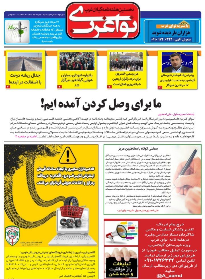 به گزارش نوای گیلانغرب جدیدترین شماره ۵۸ هفته نامه نوای غرب با مطالب متنوع منتشر شد