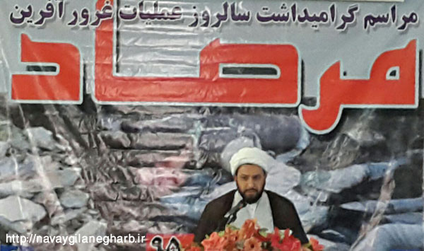 دراین مراسم دلاوری های رزمندگان اسلام درهشت سال دفاع مقدس وعملیات مرصاد با سخنرانی حجت الاسلام والمسلمین مهری امام جمعه گیلانغرب روایت شد.