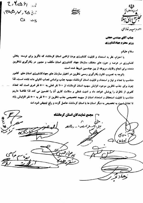 نامه مجمع نمایندگان استان کرمانشاه به وزیر جهادکشاورزی