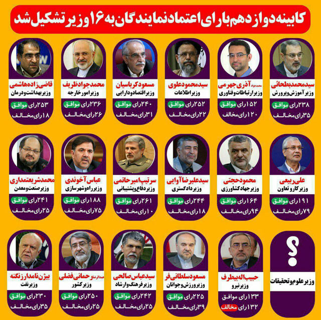 به گزارش نوای گیلانغرب  با پایان شمارش آرای نمایندگان مجلس، نتیجه نهایی رای اعتماد مجلس به کابینه دولت دوازدهم اعلام شد. بر این اساس از میان ۱۷ وزیر پیشنهادی معرفی شده به مجلس، همه وزیران باز مجلس رای اعتماد گرفتند