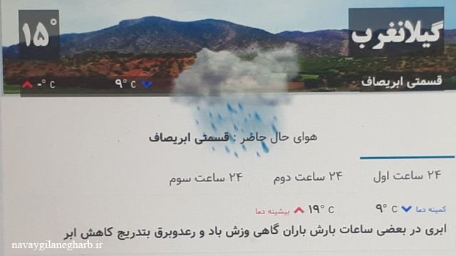 نوای گیلانغرب :به گزارش نوای گیلانغرب میزان بارشهای به ثبت رسیده از ایستگاه های هواشناسی استان کرمانشاه طی فعالیت سامانه بارشی در ۲۴ ساعت گذشته (تا ساعت ۹۰:۳۰در شهرستان گیلانغرب ۵۴ میلیمتر به ثبت رسیده است که پر بارش ترین شهر استان به خود اختصاص داده است و کم بارش ترین شهر استان با توجه به نقشه هواشناسی استان سنقر با ۹ میلیمتر می باشد