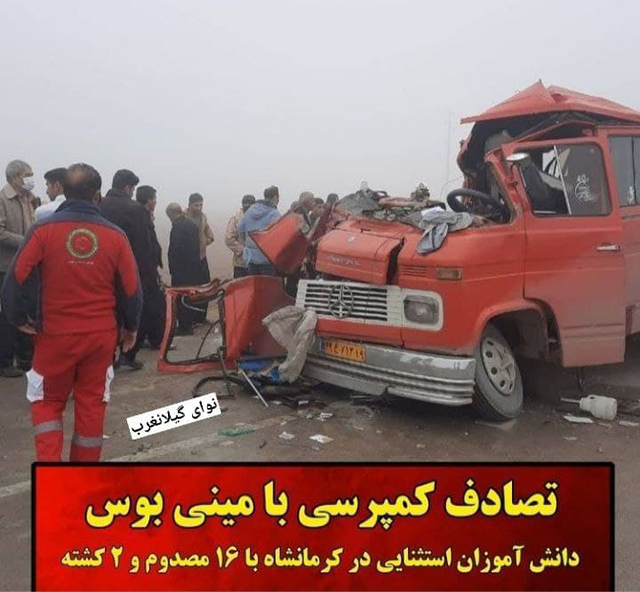 به گزارش پایگاه خبری تحلیلی نوای گیلانغرب  رفیعی، رئیس اورژانس کرمانشاه با تایید این خبر گفت: بر اثر واژگونی مینی بوس حامل دانش آموزان در محور هلشی _ ماهیدشت در کرمانشاه، دو نفر جان باختند و ۱۶ نفر مجروح شدند.